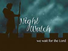 Silhouette with “Night Watch” text, starry sky.